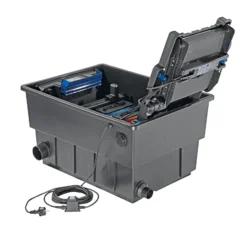 - Gravity-fed flow-through filter keeps pond water clean and clear.