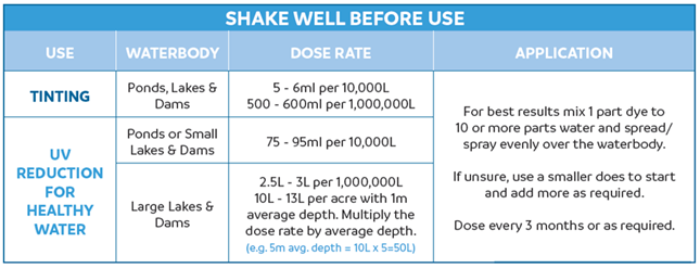 PondOZ Blue Beauty Dam & Lake Dye is a concentrated natural blue dye which is effective in reducing UV light penetration into the water, slowing algae growth. Blue Beauty also reduces water temperatures & evaporation rates in larger water bodies. PondOZ Blue Beauty Dam & Lake Dye can also be used to tint the water for aesthetic purposes. Once the dye is diluted into the water body it will not cause staining to clothes, rocks, sand or other items.