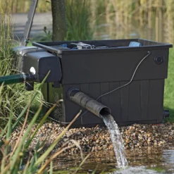 - Gravity-fed flow-through filter keeps pond water clean and clear.