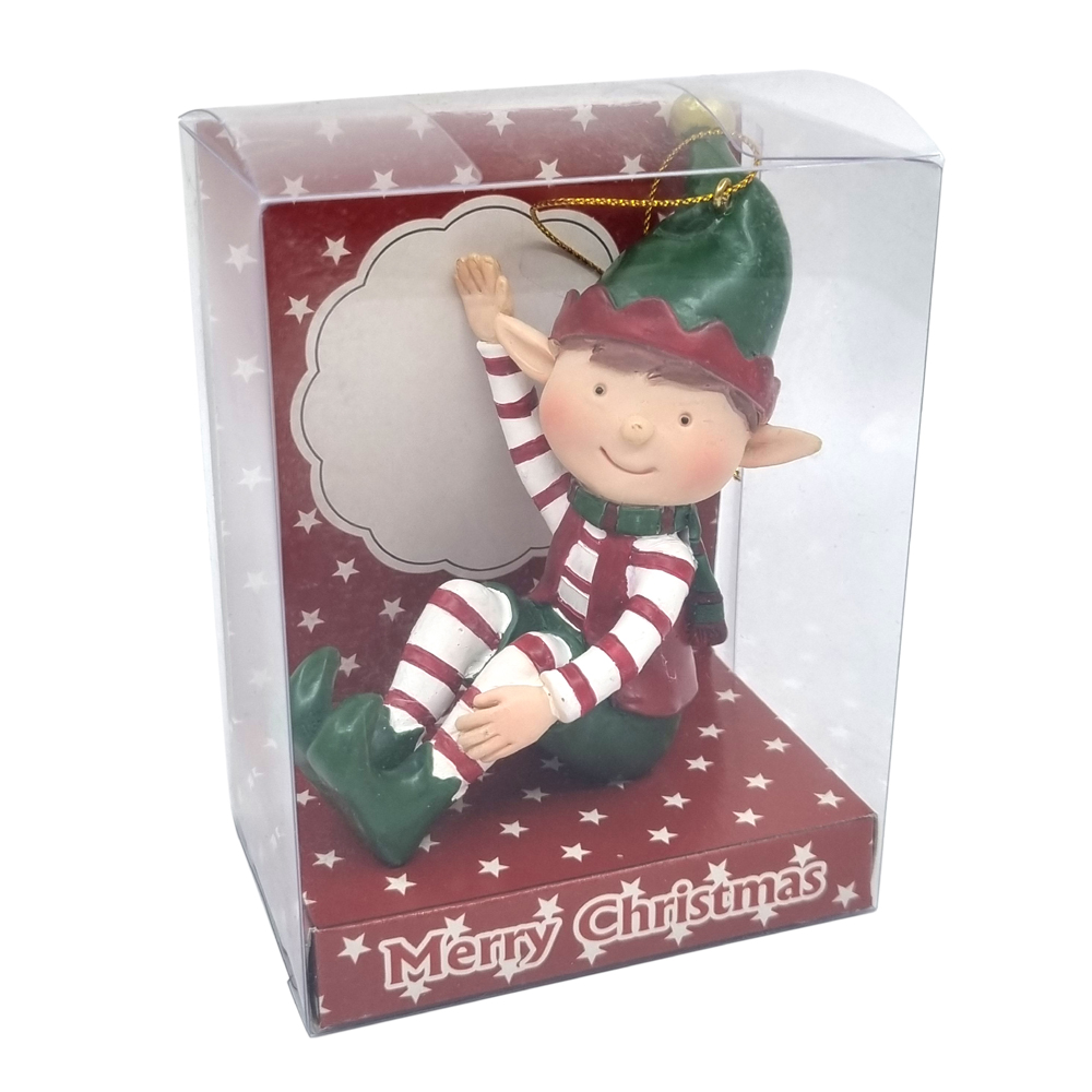Polyresin Figurine with a red hanging ribbon. Elf comes in a PVC Box.